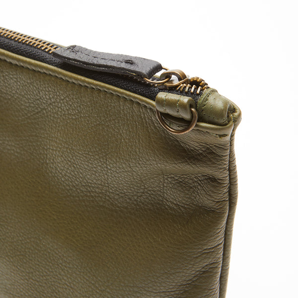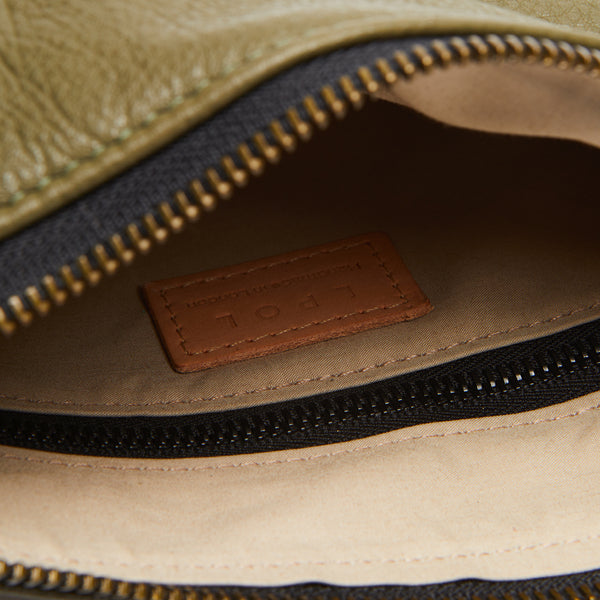 • Crafted from vegetable tanned leather • Detachable adjustable shoulder strap • Gold metal zip closure • Surplus cotton-linen lining and zip pocket • Designed and handmade in England • Protect and restore using natural beeswax